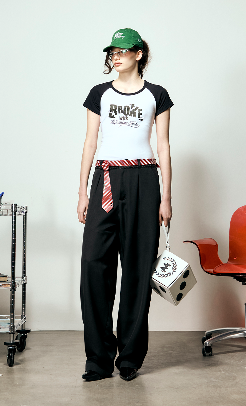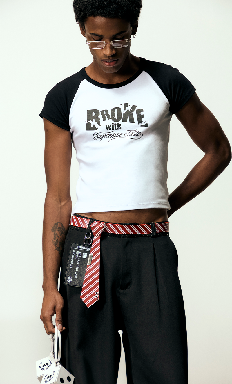 A Baby Tee Broke With Expensive Taste é justa no corpo com as mangas contrastantes, combina com qualquer look. Um toque divertido e ousado feito com estamparia digital.